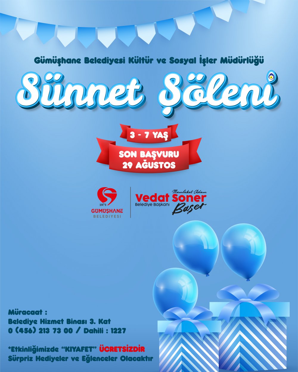 Etkinlik ile ilgili açıklama yapan Gümüşhane Belediye Başkanı Vedat Soner Başer, “Gümüşhane Belediyesi olarak çocuklarımız için sünnet şöleni organize ediyoruz. İlimiz genelinde dar gelirli ve ihtiyaç sahibi ailelerin çocuklarının sünnetlerini Gümüşhane Belediyesi olarak gerçekleştireceğiz. Onların erkekliğe ilk adım atma sevincine ortak olacağız. Sünnet işlemleri, alanında deneyimli sağlık ekiplerimiz tarafından hijyenik bir ortamda yapılacaktır. Çocuklarımız sürecin her aşamasında titizlikle takip edilecektir. Sünnet edilecek çocuklarımız için kayıtlarımız bugün itibariyle başlamıştır. Ebeveynlerin, kayıt sırasında gerekli olan evrakları eksiksiz şekilde teslim etmeleri önem arz etmektedir. Ayrıca, Toplu Sünnet Şöleni için başvuru sırasında çocukların ayakkabı numaraları, beden bilgileri ve baş çevresi ölçülerinin de belirtilmesi gerekmektedir. Bu bilgilerin eksiksiz ve doğru bir şekilde verilmesi, organizasyonun daha sağlıklı ve düzenli bir şekilde yürütülmesini sağlayacaktır.” şeklinde konuştu.