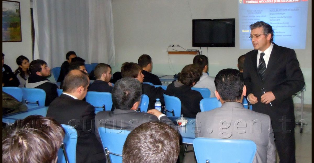 Gümüşhane Üniversitesi kampüs alanı içerisinde bulunan Yüksek Öğrenim Kredi ve Yurtlar Kurumu Gümüşhane Kız Öğrenci Yurdunda yurt çalışanları ve üniversite öğrencilerinden oluşan yaklaşık 250 kişinin izlediği konferansta, Gümüşhane Emniyet Müdürlüğü TEM Şube Müdürü 4. Sınıf Emniyet Müdürü İsmail Çebi, “Terör ve terörizmin tanımı, amacı, nedenleri, ülkemizde tarihi gelişimi, ülkemize verdiği zararlar, terör örgütlerini ayakta tutan unsurlar, gençlik nedir, terör örgütlerinin gençliği hedef alma nedenleri, terör örgütlerinin eleman kazanma yöntemleri” konularında detaylı bilgiler verdi.