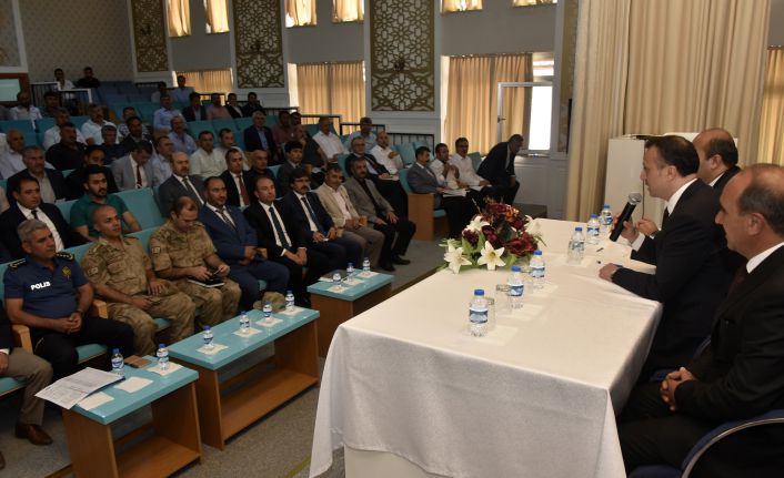 Vali Taşbilek, Kelkit Abdulhamit Han Anadolu İmam Hatip Lisesi toplantı salonunda Kelkit Kaymakamı Aziz Onur Aydın ve Kelkit Belediye Başkan Vekili İrşadi Bilgin ile köy ve mahalle muhtarlarıyla istişare toplantısı düzenledi.