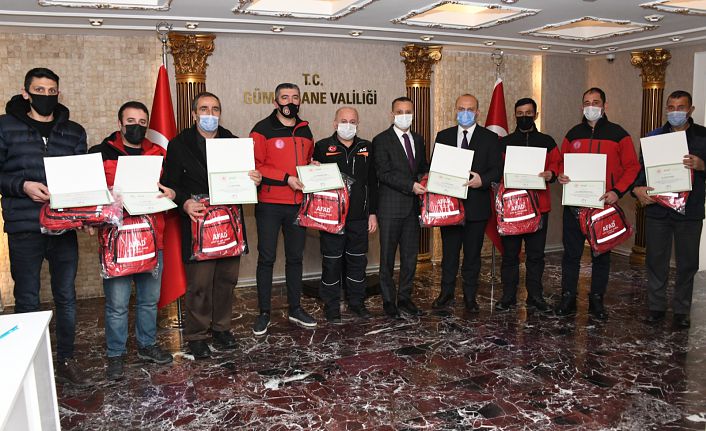 Valilik makamında yangın söndürme çalışmalarına bizzat katılan Gümüşhane Belediyesi İtfaiye ve İl Özel İdaresi personelini kabul eden Vali Kamuran Taşbilek, görevli personele teşekkür belgesi ve hediyelerini takdim etti.