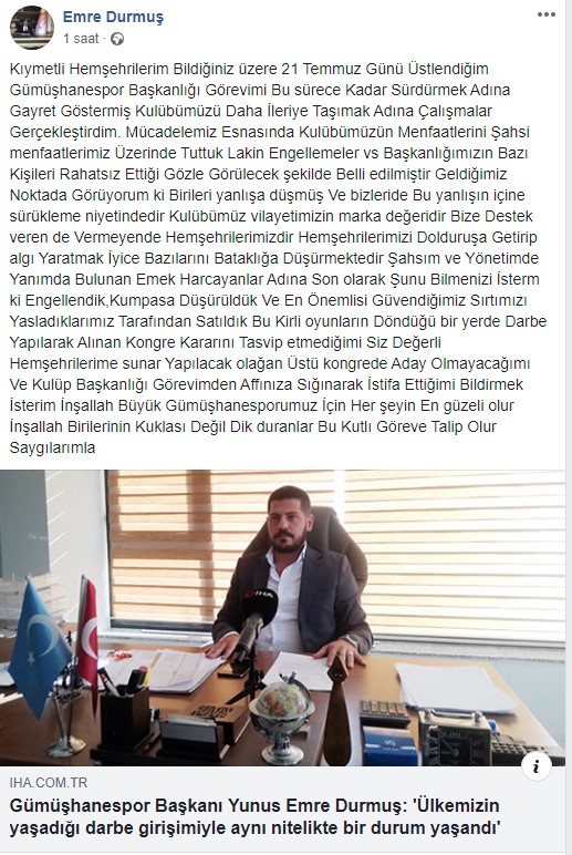 Yaptığı açıklamada 21 Temmuz tarihinden beri görevini sürdürdüğü Gümüşhanespor kulüp başkanlığı görevinden istifa ettiğini kaydeden Durmuş, “Kıymetli Hemşehrilerim bildiğiniz üzere 21 Temmuz günü üstlendiğim Gümüşhanespor Başkanlığı görevimi bu sürece kadar sürdürmek adına gayret göstermiş, kulübümüzü daha ileriye taşımak adına çalışmalar gerçekleştirdim. Mücadelemiz esnasında kulübümüzün menfaatlerini şahsi menfaatlerimiz üzerinde tuttuk. Lakin engellemeler vs başkanlığımızın bazı kişileri rahatsız ettiği gözle görülecek şekilde belli edilmiştir Geldiğimiz noktada görüyorum ki birileri yanlışa düşmüş ve bizleri de bu yanlışın içine sürükleme niyetindedir. Kulübümüz vilayetimizin marka değeridir. Bize destek veren de vermeyende hemşehrilerimizdir. Hemşehrilerimizi dolduruşa getirip algı yaratmak iyice bazılarını bataklığa düşürmektedir. Şahsım ve yönetimde yanımda bulunan, emek harcayanlar adına son olarak şunu bilmenizi isterim ki engellendik, kumpasa düşürüldük ve en önemlisi güvendiğimiz, sırtımızı yasladıklarımız tarafından satıldık. Bu kirli oyunların döndüğü bir yerde darbe yapılarak alınan kongre kararını tasvip etmediğimi siz değerli hemşehrilerime sunar, yapılacak olağanüstü kongrede aday olmayacağımı ve kulüp başkanlığı görevimden affınıza sığınarak istifa ettiğimi bildirmek isterim. İnşallah büyük Gümüşhanesporumuz için her şeyin en güzeli olur. İnşallah birilerinin kuklası değil dik duranlar bu kutlu göreve talip olur saygılarımla” dedi.
