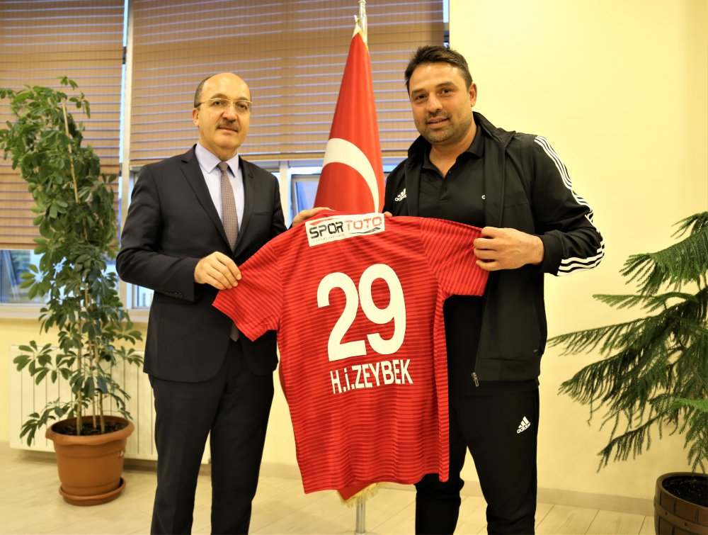 Rektörlük makamında gerçekleşen ziyarette Teknik Direktör Fatih Akyel tarafından Rektör Zeybek’e üzerinde isminin yazılı olduğu 29 numaralı Gümüşhanespor forması hediye edildi.
