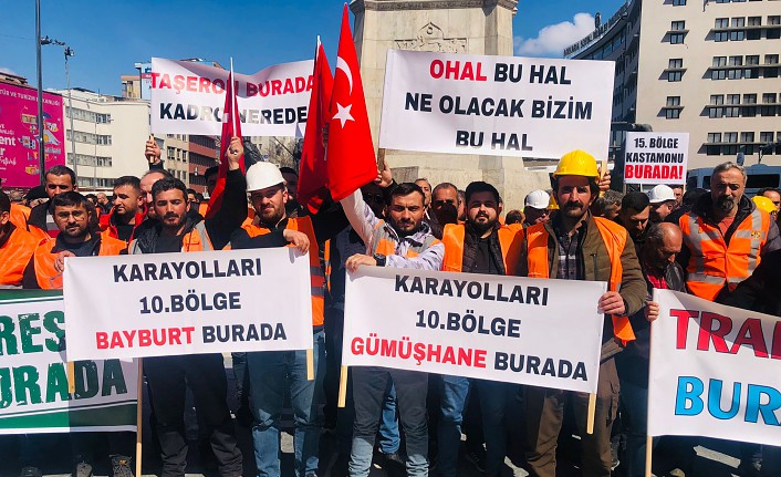 Aralarında Gümüşhane’deki Karayolları Şube Şefliğinde görev yapan 18 çalışanın da yer aldığı grup Ankara Ulus’ta buluşarak “Taşeron burada kadro nerede”, “Karayolları asıl işi yapan taşeron işçilerine hakkı olan kadro verilsin’, “Ohal bu hal ne olacak bizim bu hal” yazılı dövizlerle taleplerini dile getirdi.