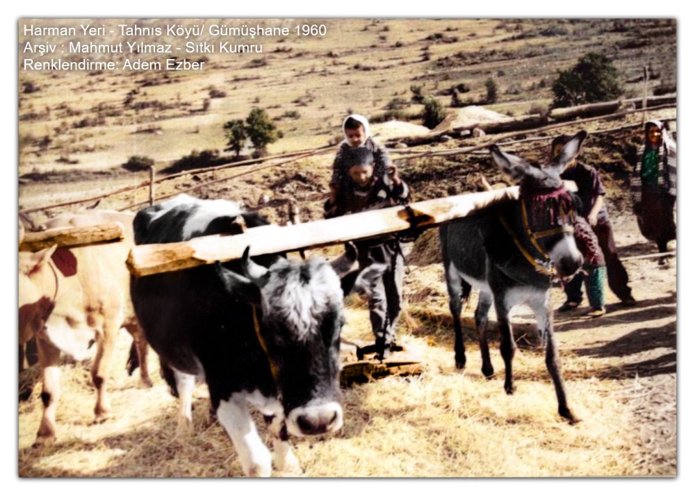 Bazı fotoğraflar vardır açar bakar, kapatamazsınız, bazı şarkılar vardır başlatır durduramazsınız. Bu fotoğrafta öyle bence. Fotoğrafın sahibi bakarken çok hüzünleniyordur eminim. Belkide ağlıyordur! Anne, kardeş, arkadaş, öküz, inek, eşşek, harman yeri, yaz sıcağı, çile, mutluluk, yokluk, yorgunluk, sadelik, birlik beraberlik, ... var bu karenin içerisinde. Harman yeri tam bir curcuna olmuş, kara öküzle karakaçan birlikte koşulmuş gem'e. Delikanlı gençlik enerjisiyle hareket halindeki gem üzerinde ayakta durabilmiş, birde kardeşini omuzuna almış. Yandakiler ise sabırsızca sıralarını bekliyorlar, gem'in üzerinde tur atabilmek için. Ne de keyifliydi değil mi? Hem iş görülecek hemde oyun oynanacak. Koca harman iki çocugun oyun hevesine kalmış, yada çocuklar oyun oynadıklarını sandığı işin gerçekten farkındalar mı ?