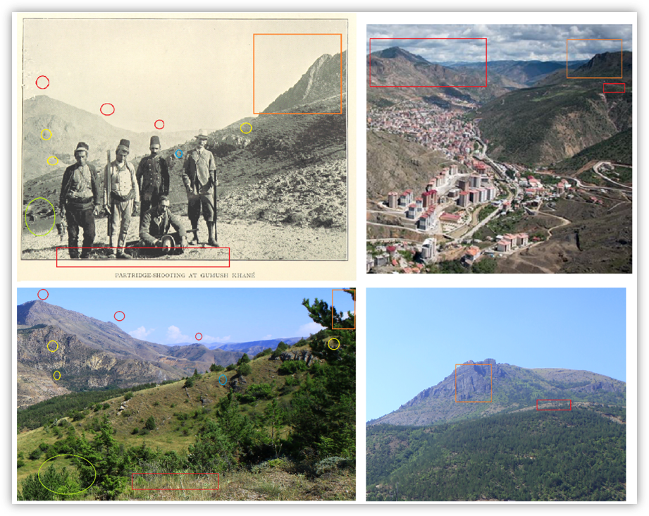 Meğer o detayları o zamanlar yakalamışım. Tamda seyyahların gidip fotoğraf çektiği yerlerdi oralar. Lakin ne keklik görmüştük ne de keklik sesi duymuştuk. Anlaşılan gezginler Eskişehir’den Karataş’a doğru bilinen patika yolla gitmişler. Karataş’ın altında bulunan o küçük düzlükte tuzaklarını kurmuşlar, “Kekliği düz ovada avlarlar” sözü mucibince olsa gerek. Hatırımda kalan burada birde göze vardı, belki de su içmeye gelen kekliklere göz koymuş olabilirler. Yaptığım eşleştirme çalışması ile Karataş mevkisin deki detayları eski ve yeni fotoğraflarda işaretlemeye çalıştım. Arkada gözüken Kuşakkaya’nın devamı olan dağlar, tepeler ise cuk diye oturuyor yerli yerine.