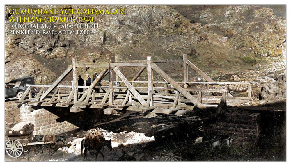 Cumhuriyet dönemi sonrası, gelişen Türkiye'de ilk yatırım yapılan sahalar arasında Yol Projeleri dikkat çekmiştir. Özellikle ticaret yol güzergahlarının önceliklendirildiği görülmektedir. Tarihi İpekyolu güzergahında bulunan Gümüşhane'nin zorlu yolları 1940'lı yıllarda yapılan yatırımlarla Şose yol statüsüne kavuşmuş, dere, hemzemin geçitleri ve destekleyici taş duvarlar yapılmıştır. Bu yapılar halen günümüzde dahi kullanılmaya devam edilmektedir. İmar çalışmalarında görev alan yol mühendisi Cramer'in ismi neredeyse herkes tarafından bilinir hale gelmiştir. İyi insan ilişkileri, kaliteli iş yapması bunun en büyük nedenlerindendi. Bir devrin dönüşüm hikayesi olabilecek fotoğraf tamda zamanında çekilmiş. Üstte yenilik ve teknoloji, alt tarafta zorlu derelerden geçmeye çalışan yük taşıyıcıları (küçük kervan). Tehlikeli, dar ve yorucu patika yollar ne çokta kahırlarını çekti eskilerimizin, değilmi? Yollar, hava koşullarına, mevsime göre davranırdı insanlara. Dereden sel gelse kim geçebilirdi kaşıya. Heyelan, yağmur, çamur, kar, taşlık arazi, .... Yükü taşıyan atlar, develer, katırlar yorgun, birlikte yayan yürüyen insanlar dahada yorgundu. Yazlık yol, kışlık yol diye isimlendirilirdi güzergahlar. Hanlar vardı, hamamlar vardı, açık hava bol oksijen vardı, lakin yollar tehlikeli idi, sis, uçurum, eşkiya korkusu da vardı. Şimdi neredeyse hatıralarda bile kalmayacak hale geldi o çileli günler. Trabzon Gümüşhane arası gidiş geliş 3 gün olarak bilinirmiş o dönemlerde. Günümüzde ise Trabzon Gümüşhane arası gidiş neredeyse 45 dakikaya düştü. Bakalım gelecek nesiller bizilerin hangi dönüşümünü bu şekilde kaleme alacak ?