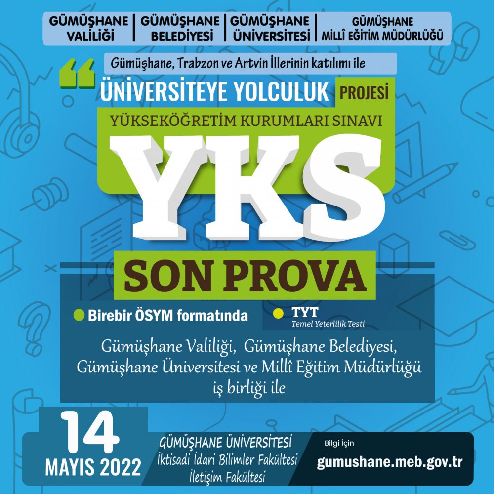 Trabzon İl Milli Eğitim Müdürlüğü koordinasyonunda, Gümüşhane Üniversitesi, Gümüşhane İl Milli Eğitim Müdürlüğü ile yürütülen ve bu yıl 8.si yapılacak olan "Üniversiteye Yolculuk Projesi" kapsamında 14 Mayıs 2022 Cumartesi günü üniversiteye girmeyi planlayan gençleri gerçek sınav psikolojisine hazırlamak amacıyla YKS ile aynı formatta deneme sınavı yapılacak.