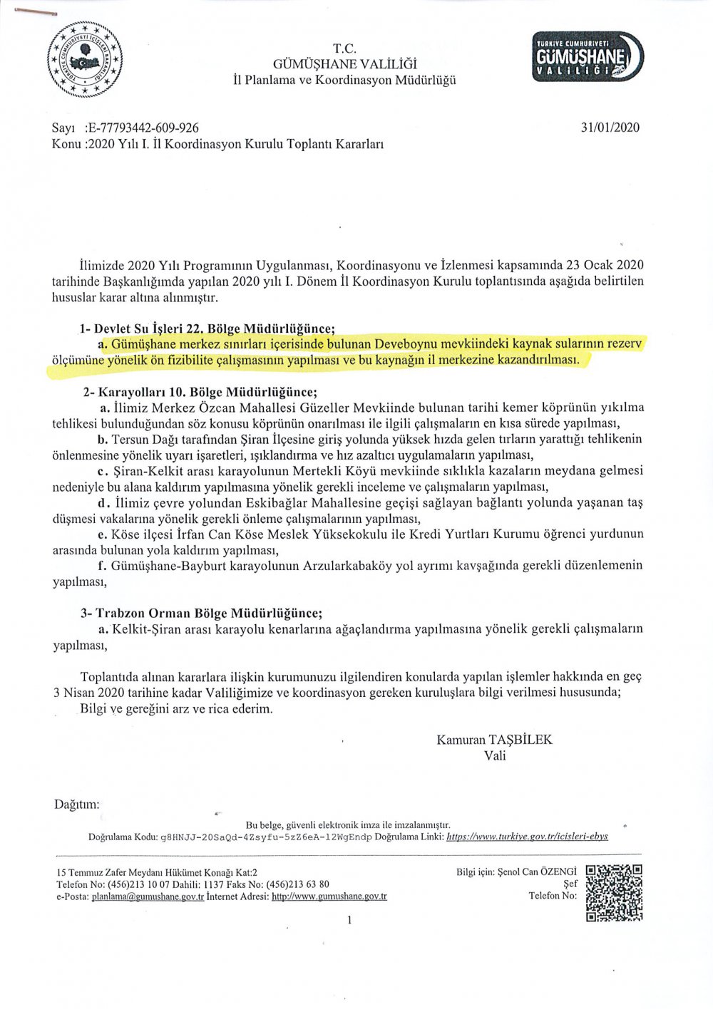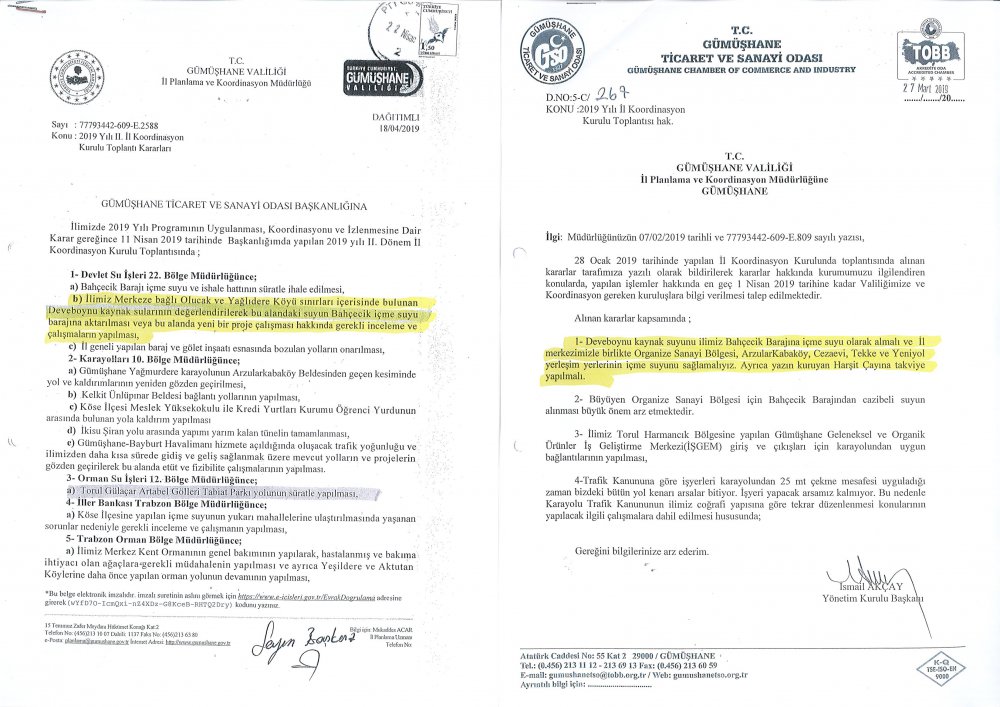 Gümüşhane Ticaret ve Sanayi Odası(GTSO) Başkanı İsmail Akçay, Deveboynu suyunun kullanıma yönelik herhangi bir memba kullanım tahsis kararının olmadığını belirterek, “Bir su kaynağının kullanılması için ilin yetkili kurumlarından Memba kullanım tahsis kararı alınmalıdır.  Şuan itibari ile deveboynu suyunun kullanımı ile ilgili alınmış bir Memba tahsis kararı mevcut değildir. Dolayısıyla Deveboynu suyunun tasarrufu ile yapılan işlerin ve ortaya atılan söylemlerin hiçbir geçerliliği yoktur” değerlendirmesinde bulundu.