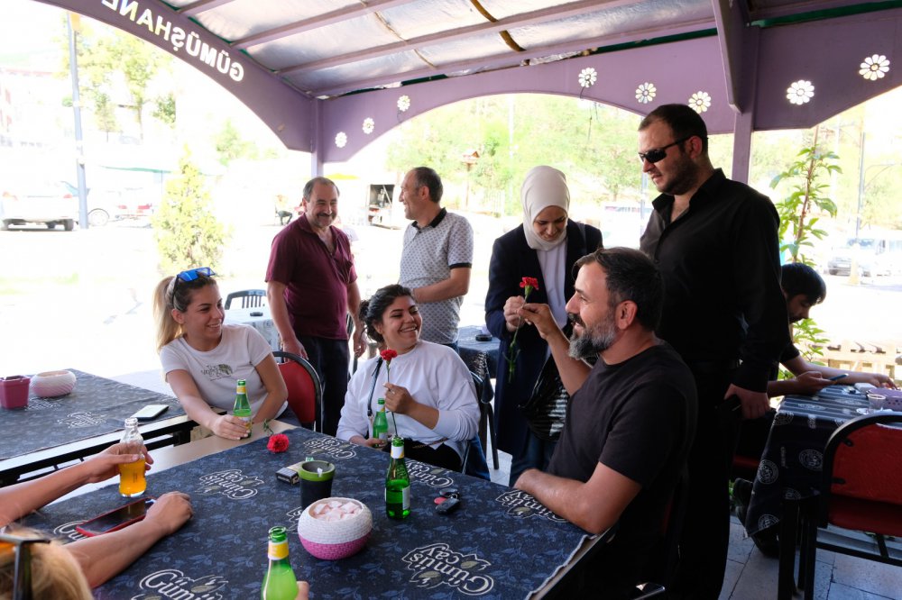 Açıklamanın ardından Bektaş ve esnaflar çay ocaklarında oturan vatandaşlara gül dağıttı.