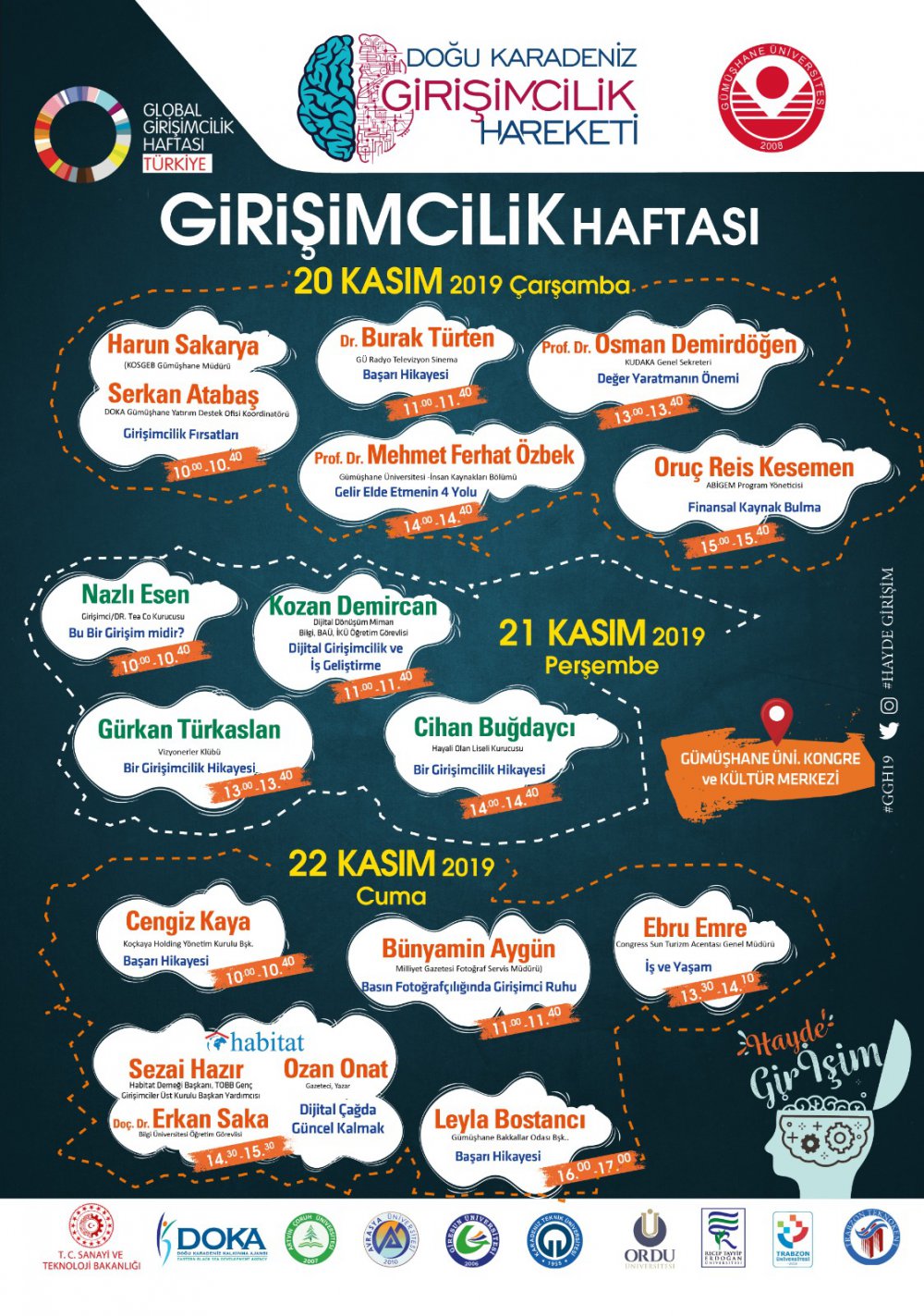 Bu amaçla 18-19 Kasım 2019 tarihlerinde Avrasya Üniversitesi, Gümüşhane Üniversitesi, Karadeniz Teknik Üniversitesi ve Trabzon Üniversitesi öğrencilerinin katılımı ile Trabzon ilinde İnovasyon Kampı etkinliği gerçekleştirilecek, 20-22 Kasım 2019 tarihleri arasında ise “girişimcilik” teması altında konuk konuşmacıların katılımı ile Gümüşhane Üniversitesinde bir söyleşi programı düzenlenecek.