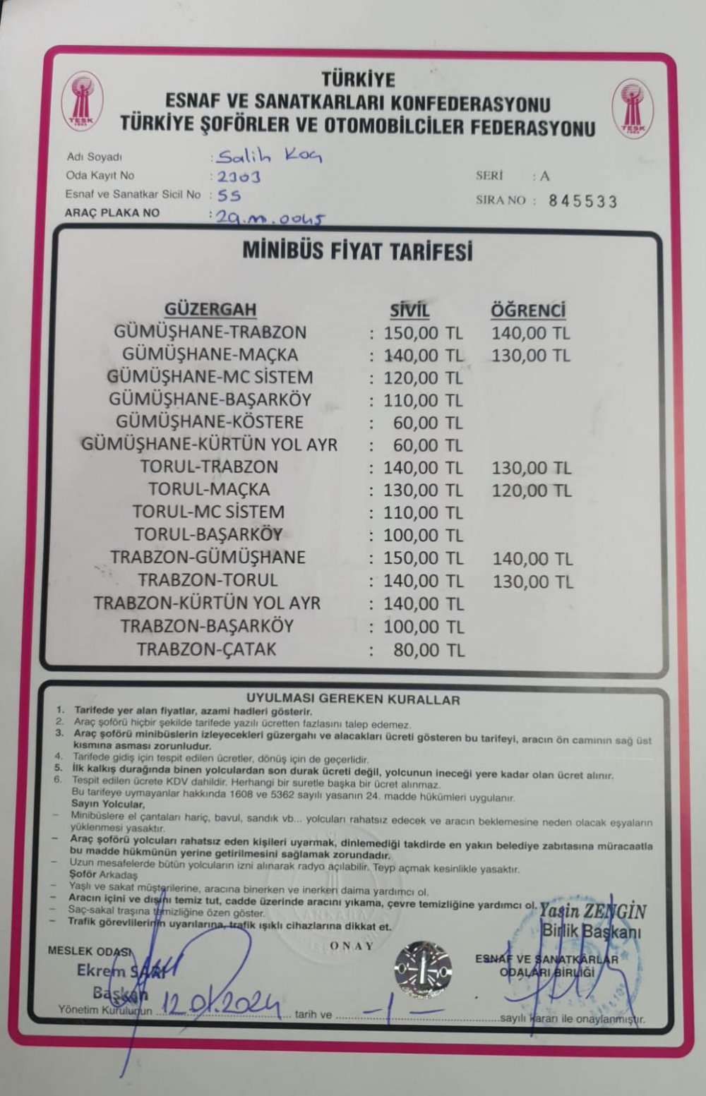 Konu hakkında açıklama yapma gereği duyduğunu belirten Başkan Sarı, “Bizler 5362 sayılı Esnaf ve Sanatkârlar Meslek Kuruluşları Kanununun 62. Maddesine göre fiyat tarifesi hazırlarız. Bu süreçte çok hassas davranmaktayız. Üyelerimiz tek tek dilekçelerle odamıza başvurularını yaparlar. Bizlerde kooperatif yönetimi ile toplanır yıllık baz da Gümüşhane-Trabzon ve Trabzon-Gümüşhane arasında giden araç sayısını, ortalama yolcu sayısını, çalışılan personel sayısını, araç giderlerini tek tek irdeleyerek fiyatı belirleriz. Belirlenen fiyat Gümüşhane Şoförler Odasının Yönetim Kurulunun onayına sunulur. Onaydan geçen fiyat tarifesi Esnaf ve Sanatkârlar Odaları Birliğine gönderilir. Birlik yönetim kuruluna sunulur ve yönetim kurulundan onay veya reddedilir. Reddedilen tarife gerekçesi belirtilir ve süreç böyle devam eder bu sistemde böyle devam eder. Kooperatif yönetimi konu ile ilgili hassas oldukları için alınan fiyat tarifesini bir de Ulaştırma Bakanlığından onaylatmaktadırlar” dedi.