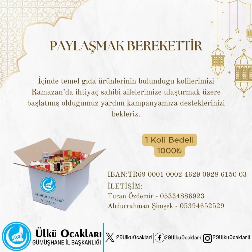 Gümüşhane Ülkü Ocakları İl Başkanlığı yaklaşan Ramazan ayı öncesinde “Her zamankinden daha fazla birbirimize ihtiyacımızın olduğu günlerdeyiz” diyerek her evde tencere kaynasın diye yardım kampanyası başlattı.