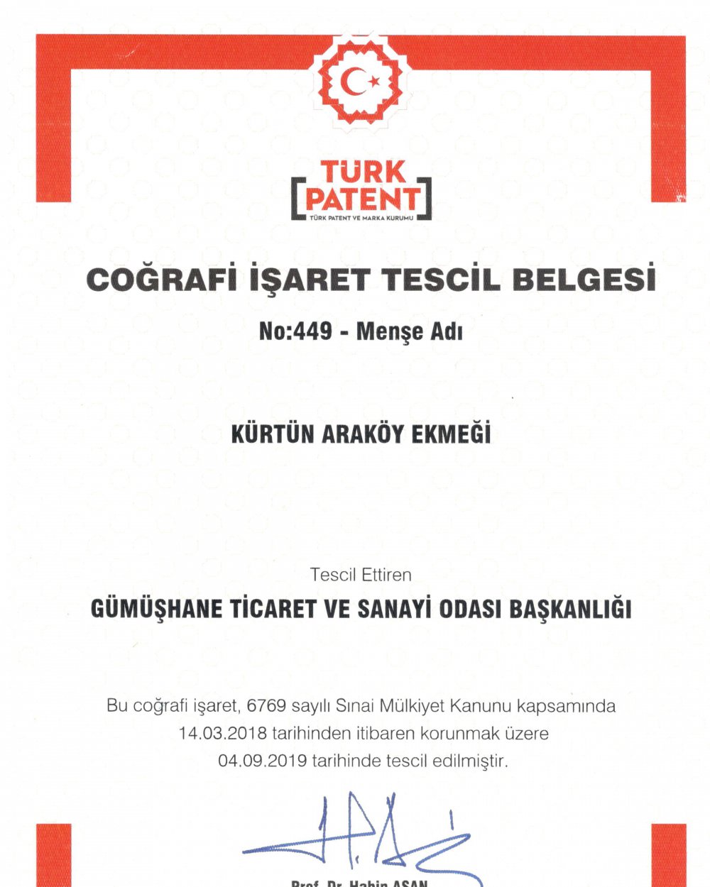 GTSO tarafından Türk Patent ve Marka Kurumu'na yapılan 4 önemli Coğrafi İşaret başvurusundan bir tanesi olan ‘Kürtün Araköy Ekmeği’ yapılan ilgili inceleme ve tetkiklerden sonra Gümüşhane’ye özgü Coğrafi İşaretli Ürün olarak tescillendi.