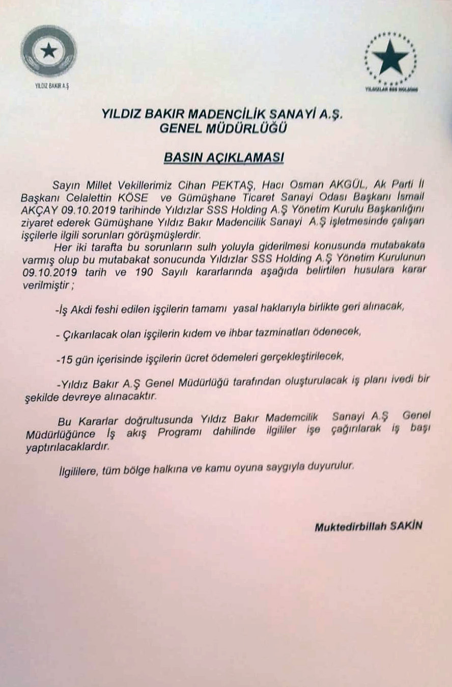Yıldız Bakır Madencilik Sanayi A.Ş. Genel Müdürü Muktedirbillah Sakin imzasıyla yayımlanan açıklamada AK Parti Gümüşhane Milletvekilleri Hacı Osman Akgül, Cihan Pektaş, AK Parti İl Başkanı Av.Celalettin Köse, Gümüşhane Ticaret ve Sanayi Odası Başkanı İsmail Akçay'ın 9 Ekim tarihinde Yıldızlar SSS Holding A.Ş. Yönetim Kurulu Başkanlığını ziyaret ederek Gümüşhane Yıldız Bakır Madencilik A.Ş. işletmesinde çalışan işçilerle ilgili sorunları görüştükleri kaydedildi.