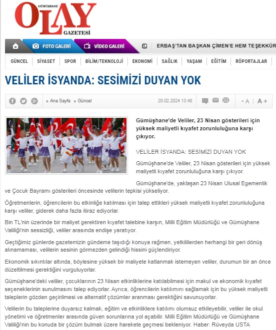 Geçtiğimiz günlerde Gümüşhane Olay Gazetesinde Sorumlu Yazı İşleri Müdürü Rüveyda Usta imzasıyla yayınlanan “Veliler İsyanda: Sesimizi Duyan Yok” başlıklı 23 Nisan Ulusal Egemenlik ve Çocuk Bayramı kutlamalarında öğretmenler tarafından öğrencilere aldırılan kıyafetlerle ilgili haberin ardından Gümüşhane Valisi Alper Tanrısever, 23 Nisan kutlama programlarına Velilere programlar için kıyafet aldırılmaması veya velilere maddi külfet oluşturmayacak kıyafetlerle katılımın sağlanması konusunda tüm okullara resmi yazı gönderdi.
