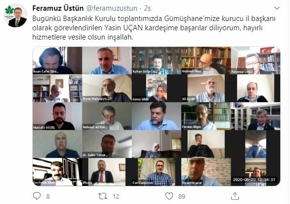 Üstün, "Bugünkü Başkanlık Kurulu toplantımızda Gümüşhane’mize kurucu il başkanı olarak görevlendirilen Yasin UÇAN kardeşime başarılar diliyorum, hayırlı hizmetlere vesile olsun inşallah" diyerek Uçan'ın başkanlığını deklare etti.