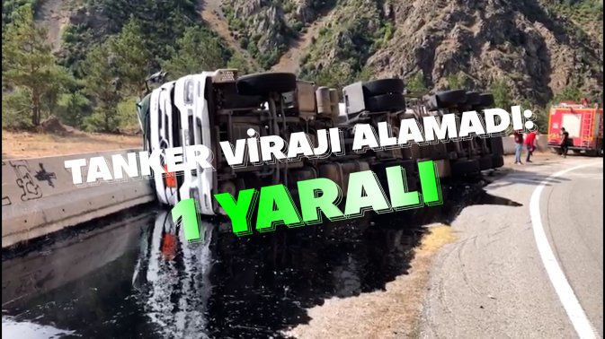 Gümüşhane’de virajı alamayan bitüm yüklü asfalt tankeri yan yattı. Tankerde bulunan bitüm karayolunu bir bölümünü kaplarken, aracın sürücüsü yaralandı.