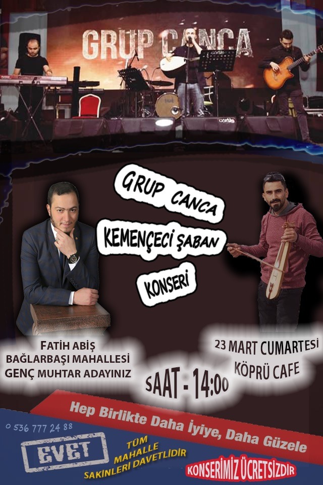 Abiş, çıktıkları bu kutlu yolda büyüklerinden ve gençlerden desteklerini isteyerek 23 Mart Cumartesi günü saat 14’de Bağlarbaşı Mahallesi köprü kafede organize ettiği Gümüşhane’nin gururları Grup Canca ve Kemençeci Şaban Çoşkun konserine tüm mahalle sakinlerini davet ederek “Konserde mahallemiz adına hayallerimizi ve sizin hayallerinizi paylaşacağım. Bu duygu ve düşüncelerle, başta ilimizde görev talip olan muhtar adaylarımıza başarılar diliyorum” ifadelerini kullandı.