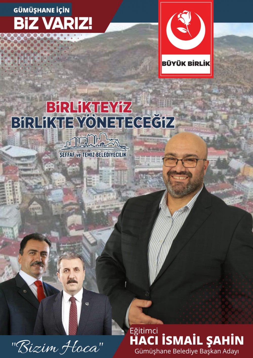 Büyük Birlik Partisi (BBP) Gümüşhane İl Başkanı Rıdvan Taşkın, 31 Mart mahalli idareler seçimlerinde Gümüşhane Belediye Başkan adaylarının Hacı İsmail Şahin olduğunu açıkladı.