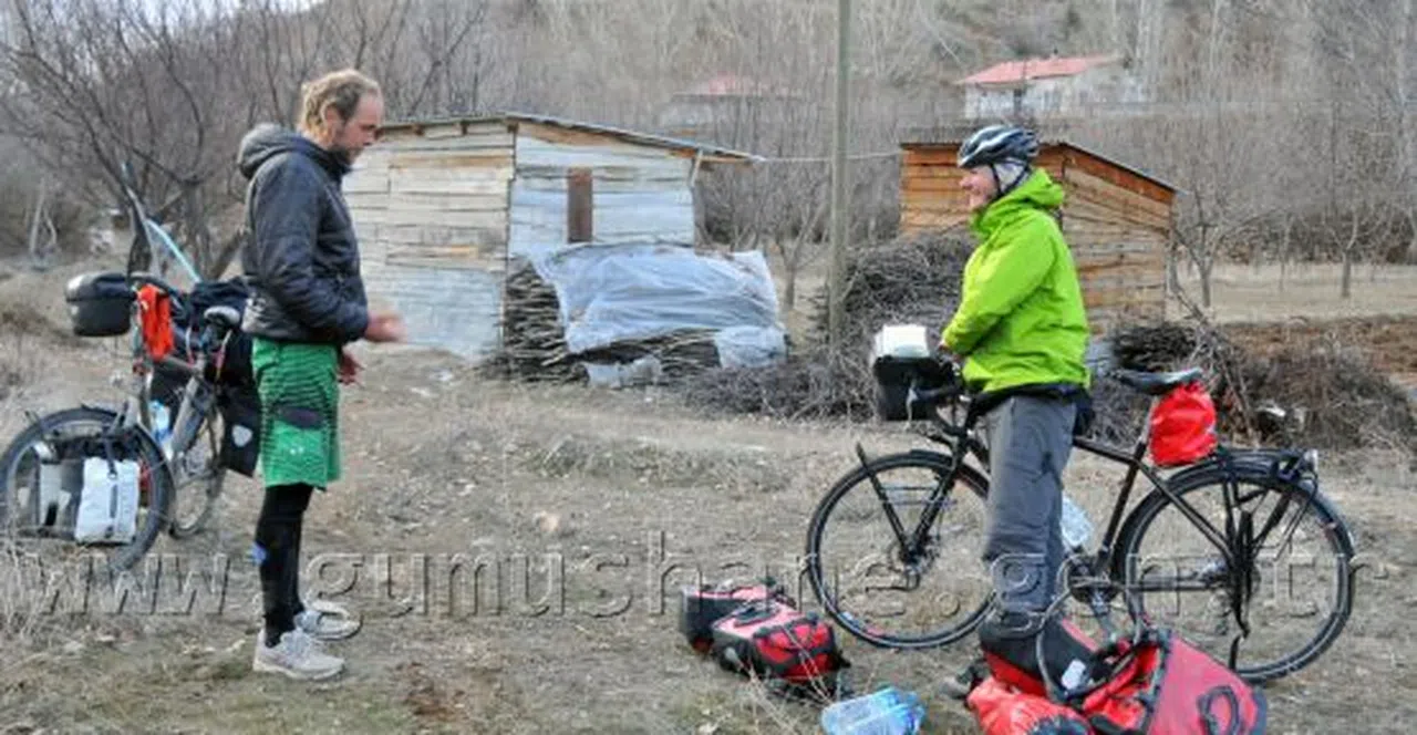 Bisikletle dünyayı dolaşan ve yolları Gümüşhane’de kesişen iki alman turistin korkulu rüyası sokak köpekleri ve bir türlü bitmek bilmeyen kış şartları oldu. Almanya’nın Heidelberg kentinde doğan ve Belçika’nın Brüksel şehrinde avukatlık yapan 30 yaşındaki Peter Betzel, 17 Mart’ta İstanbul’dan başladığı turunu bisikletin üzerinde soğuk havaya aldırmaksızın sürdürüyor. İstanbul, Yalova, İznik, Göynük, Bolu, Karabük, Safranbolu, Kastamonu, Tokat ve Erzincan üzerinden bugün akşam saatlerinde Gümüşhane’ye ulaşan Betzel, karşı istikametten gelen vatandaşı 31 yaşındaki mühendis Sven Leitschvit ile Tekke Beldesi Türkmenler Mahallesinde mola verdiği sırada karşılaştı. Birlikte program yapan ve Gümüşhane’de kamp yapmaya karara veren iki kafadar, Harşit çayının kenarına çadırları kurdu. Bölge halkından izin alarak gösterdikleri uygun alanda kamp çadırlarını kuran alman turistler Türkiye’de yaşadıkları ilginç olayları gazetecilerle paylaştı. Bisikletle İstanbul’dan başladığı turuna Çin’e kadar devam ettireceğini ve Ekim ayında tamamlamayı planladığını belirten Betzel, gezi sayesinde hem Türkiye’nin şehirlerini, dağlarını hem de insanlarını görme ve tanıma imkanı bulduğunu söyledi. Geziye nasıl karar verdiği anlatan Betzel, işyerinde iken farklı insanlar tanımak, farklı yerleri görmek üzere karar verdiğini ve o gece bilet aldığını belirterek, turun sonuna kadar yaklaşık 13-14 bin kilometre yol yapacağını söyledi. Yolculuk sırasında karşılaştıkları en büyük problemin kar ve soğuk hava olduğunu ifade eden Betzel, bir diğer sorunlarının da köpek saldırıları olduğunu ifade etti. Bazı yerlerde köpeklerin bisiklete atlayarak saldırdığının altını çizen Betzel, coğrafi yapının dağlık ve engebeli olmasının da kendisini zorladığını dile getirdi. Başından geçen ilginç olayları da anlatan Betzel, ister dağlık alanda ister şehirlerde insanların çok sıcak olduğunu belirterek, “İnsanlarınız çok sıcakkanlı. Bize her gittiğimiz yerde özellikle çay ikram ediyorlar. ‘Gel gel’ diyerek mutlaka çay içiriyorlar, para da almıyorlar.” dedi. Betzel, Türkiye’nin ardından Gürcistan, Azerbeycan, Kazakistan, Özbekistan, Kırgızistan üzerinden Çin’e ulaşacakken, Leitschvit ise Erzurum’dan İran’a, Türkmenistan, Özbekistan ve Tacikistan üzerinden Çin’e ulaşacak.
