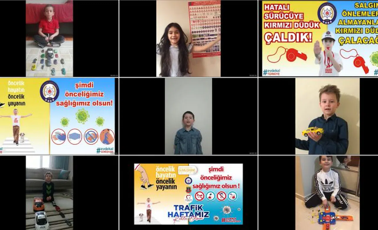 12 çocuğun yer aldığı videoda hem trafik hem de Covid-19 salgınıyla ilgili alınması gereken tedbirlerle ilgili görsel mesajlar yer aldı.