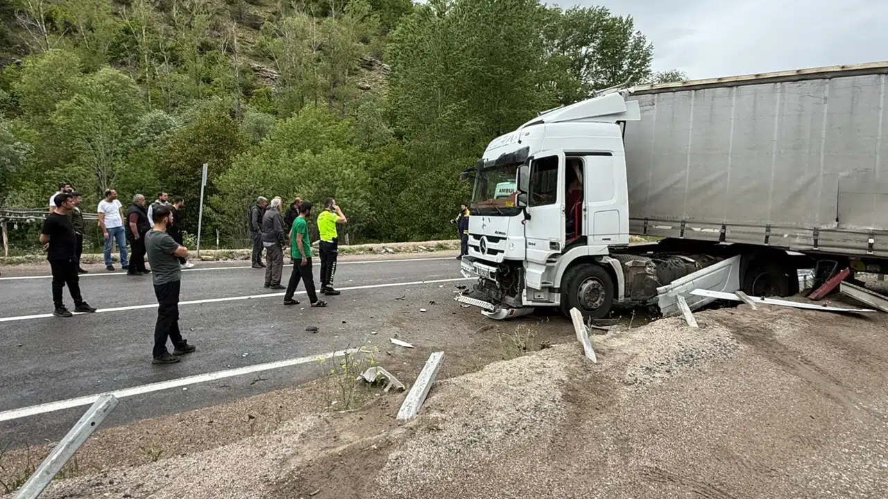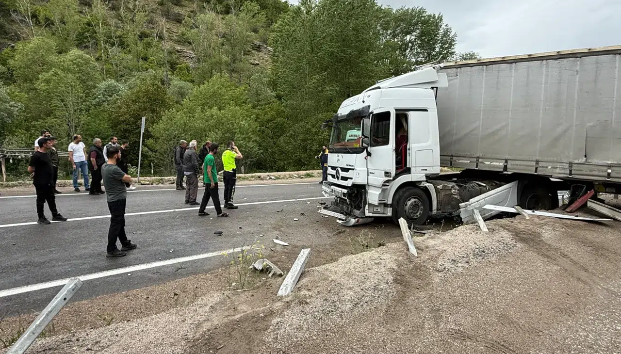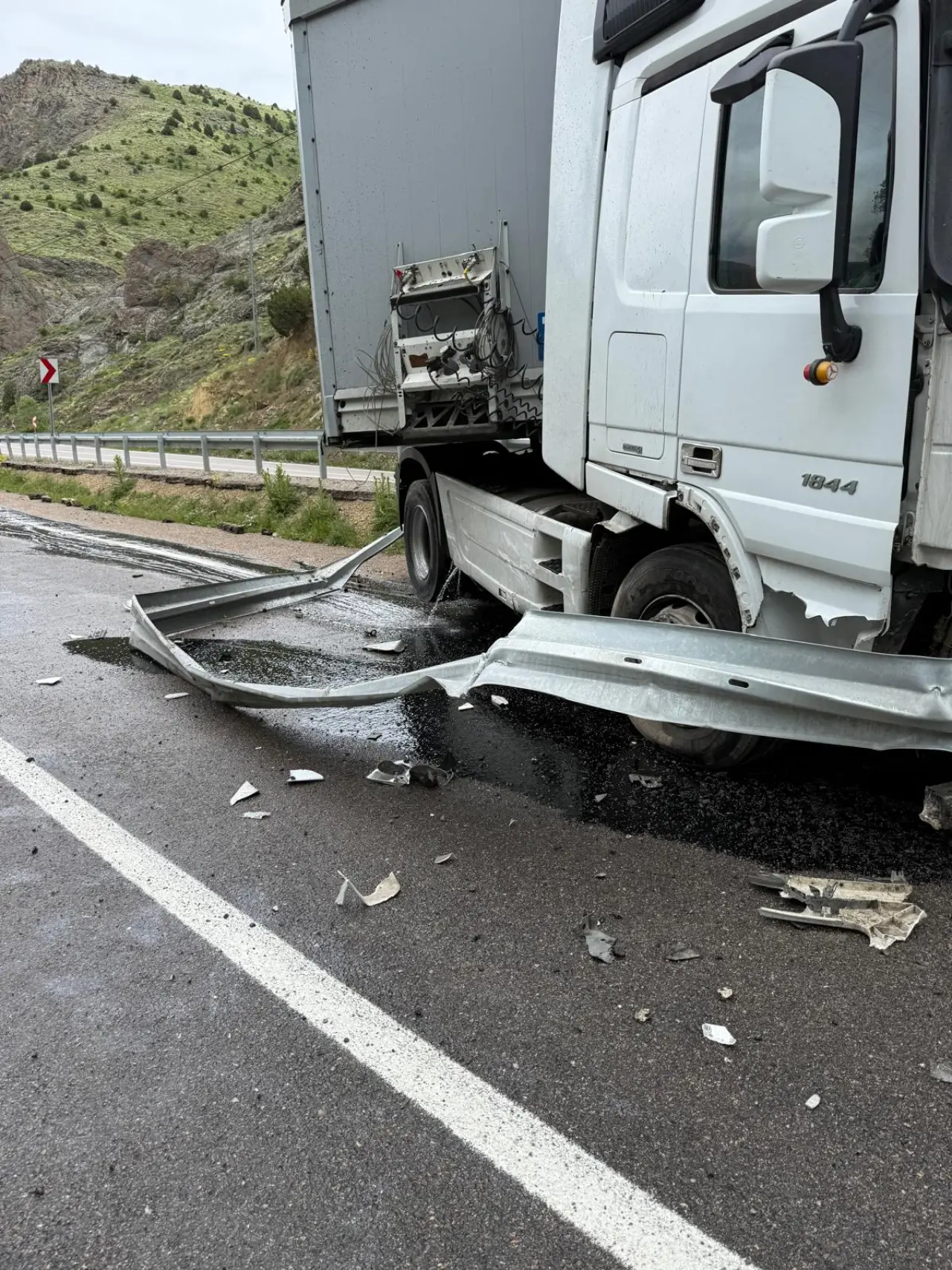 Bölünmüş yolun orta refüjünde yer alan çelik bariyerleri kırarak diğer şeride geçen tırın akaryakıt tankının delinmesi sonucu litrelerce motorin yola aktı.