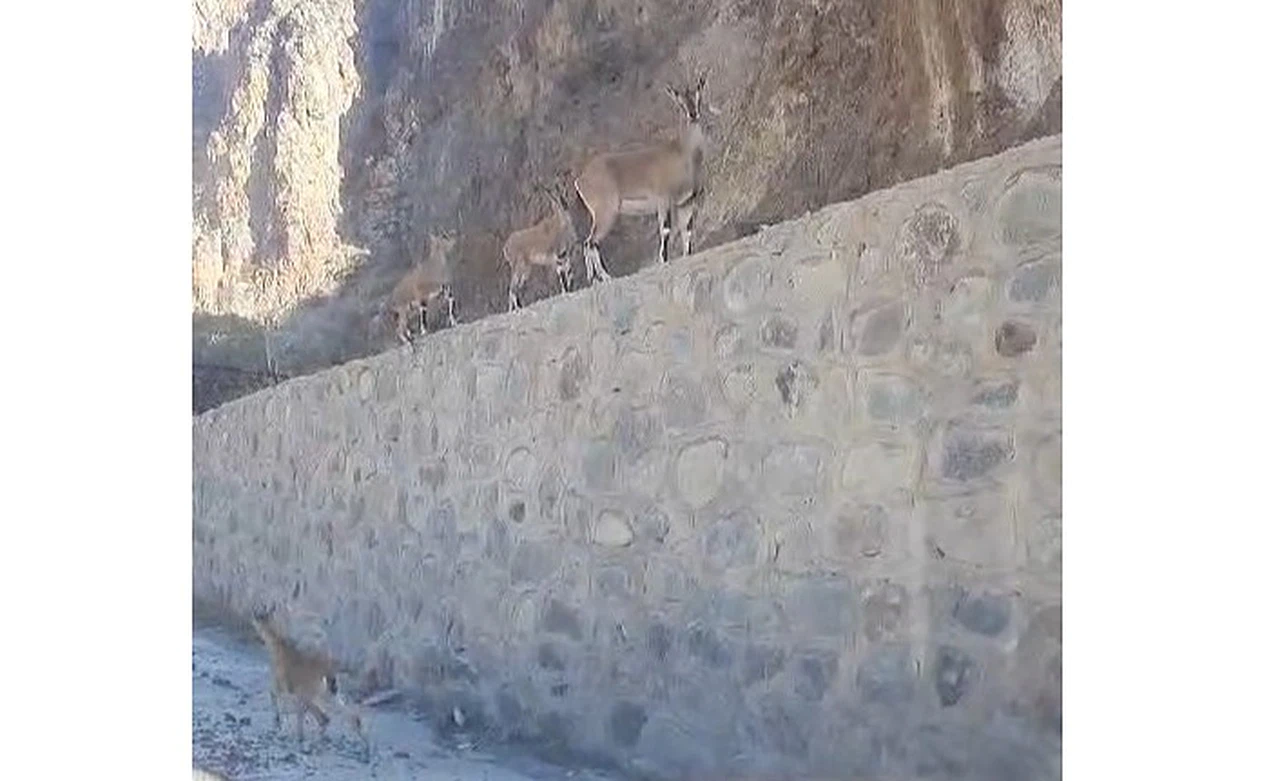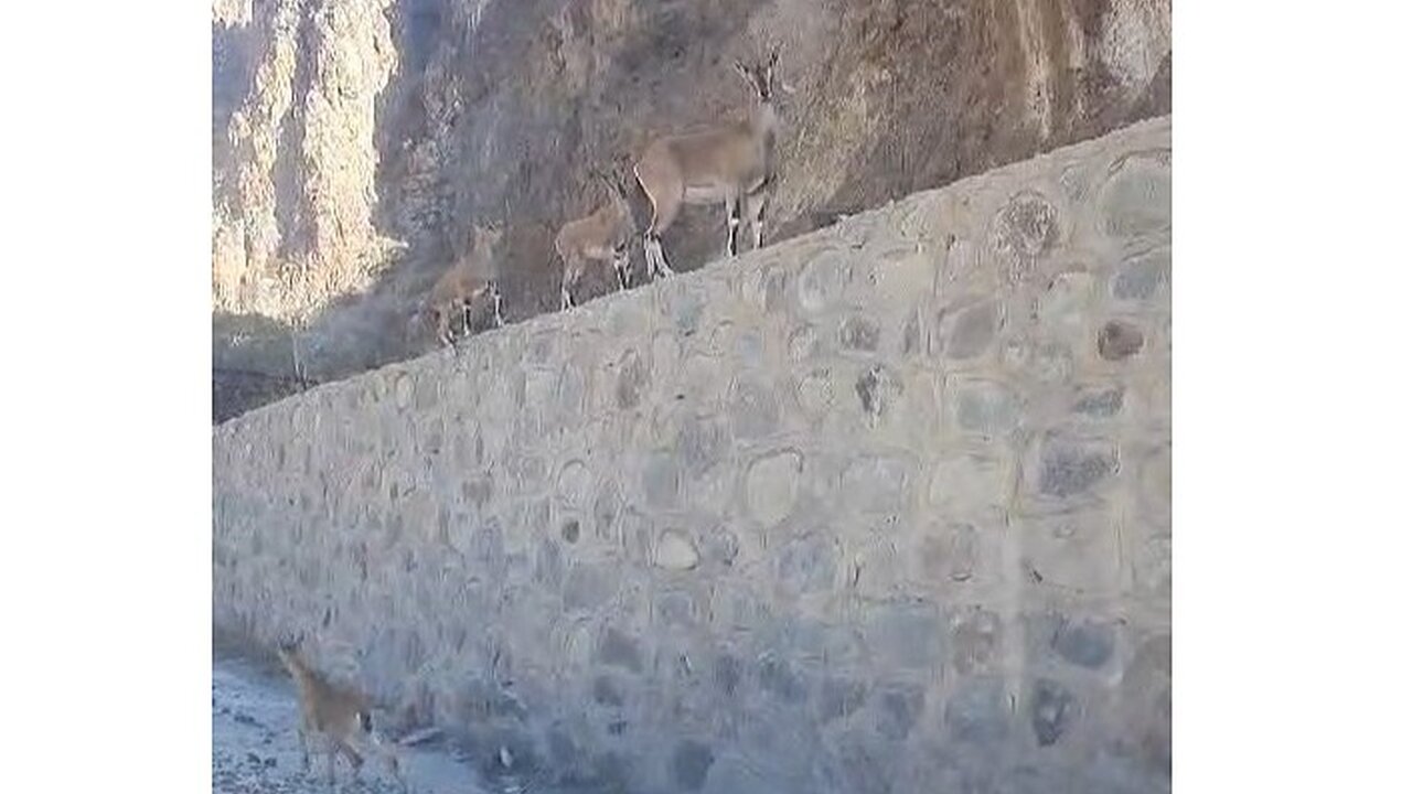 Yol kenarına kadar inen yaban keçilerini fark eden bir vatandaş o anları kayıt altına alırken, usta tırmanıcı yaban keçilerinin yol kenarında bulunan düz duvara tırmanma performansı görenleri hayrete düşürdü. Duvarın üzerine çıkan 1’i yetişkin 4 yaban keçisi dağ yamacında bir süre sonra gözden kayboldu.