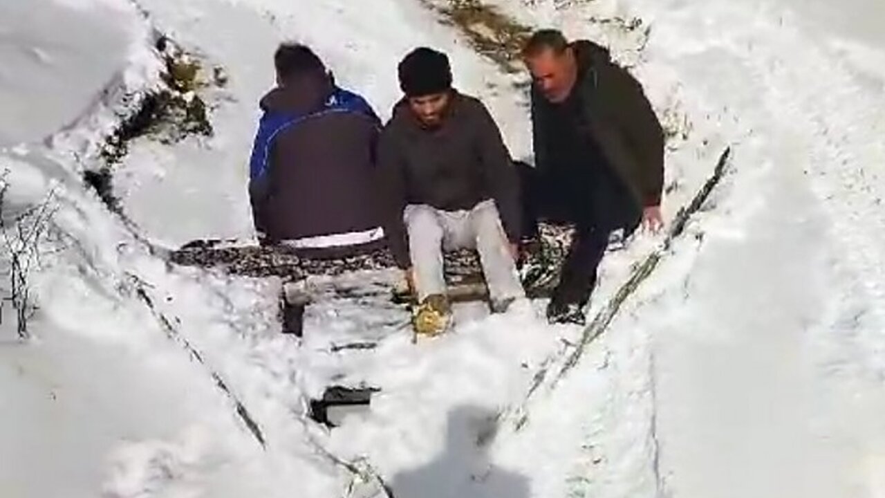 Gümüşhane’nin Torul ilçesinde kardan kapanan bağlantı yolunu açmak isteyen köy sakinlerinin bulduğu pratik ve eğlenceli çözüm izleyenleri gülümsetti.