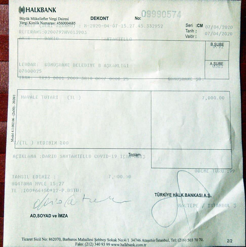 15 yıl önce Gümüşhane’de tanışan ve 29 Ekim 2019 tarihinde Gümüşhane’de nikahlarını Belediye Başkanı Ercan Çimen’in kıydığı Bulgar Mariya Vaskova Nikolova ve İtalyan Dario Santaniello çifti Gümüşhane Belediyesi’ne koronavirüs salgını nedeniyle maske ve diğer malzemeler için 7 bin TL bağışta bulundu.