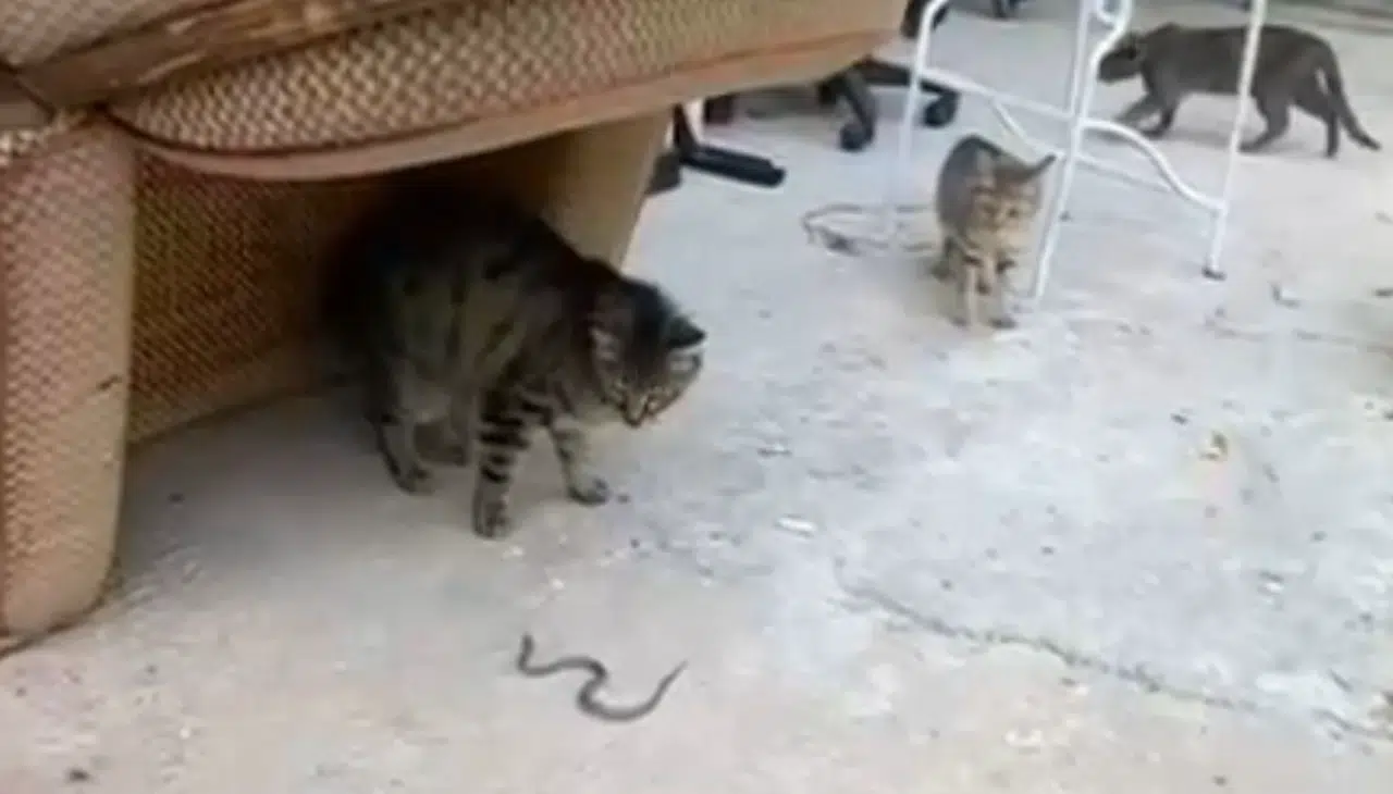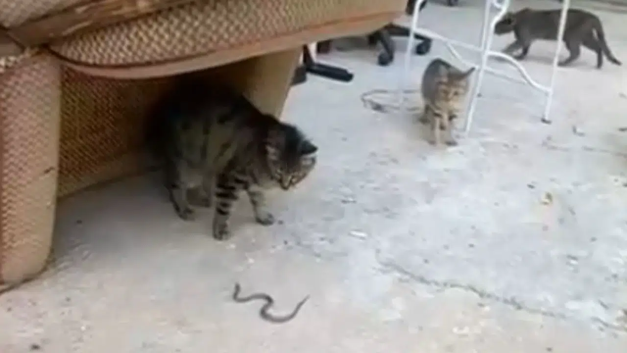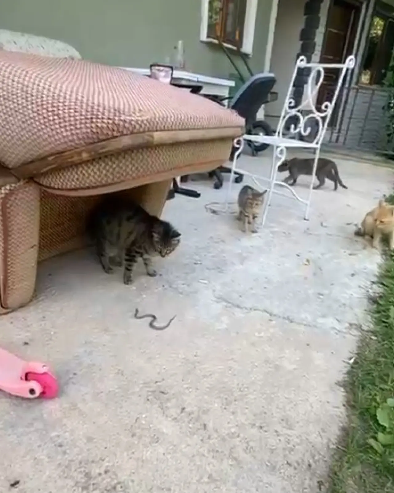 Kedilerin zaman zaman pençeleriyle dokunduğu, zaman zaman da yılanı yakalamaya çalıştığı anlar ilginç görüntüler oluşturdu.