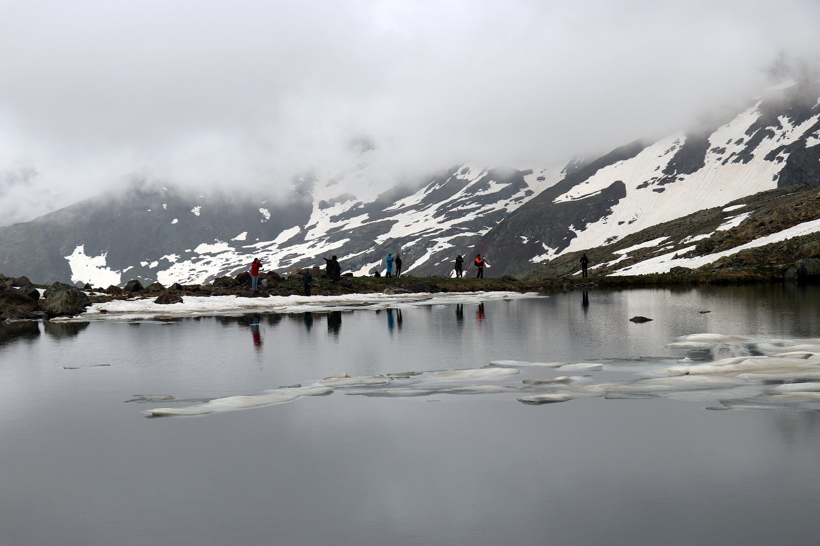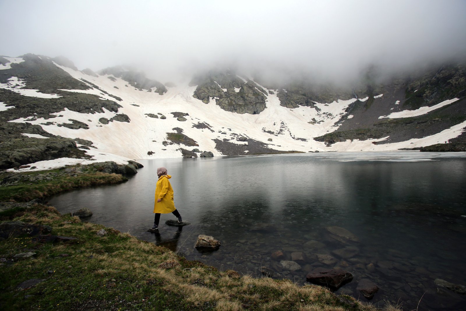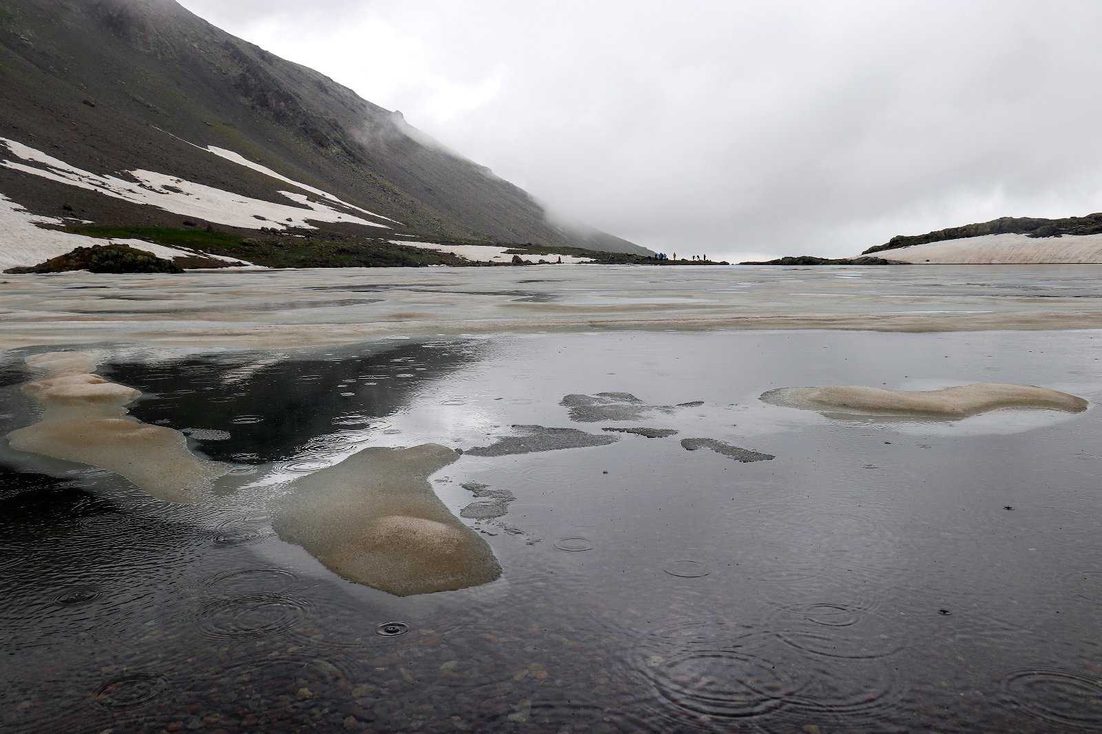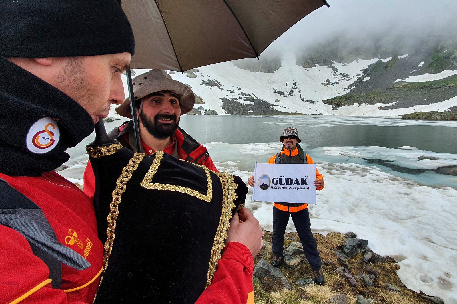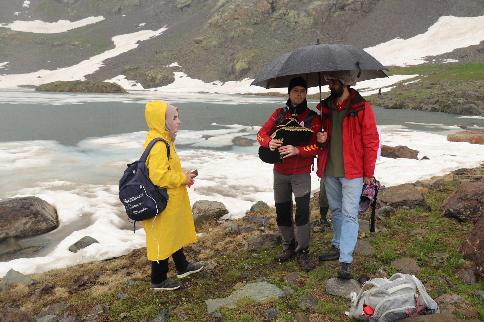 Bu noktada dolu yağışına yakalanan sporcular buzla kaplı gölde yağışa aldırmadan fotoğraf çektikten ve tulum dinledikten sonra bu kez yağmur yağışı altında 2 bin 720 metre rakımdaki Büyük göle ulaştı.