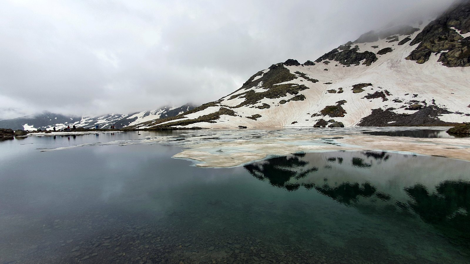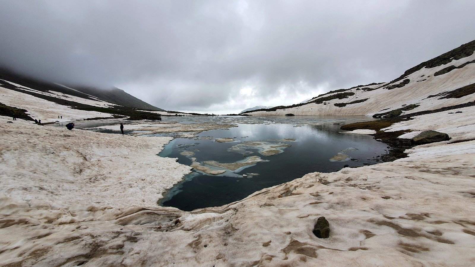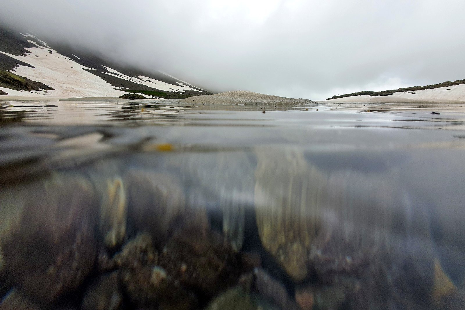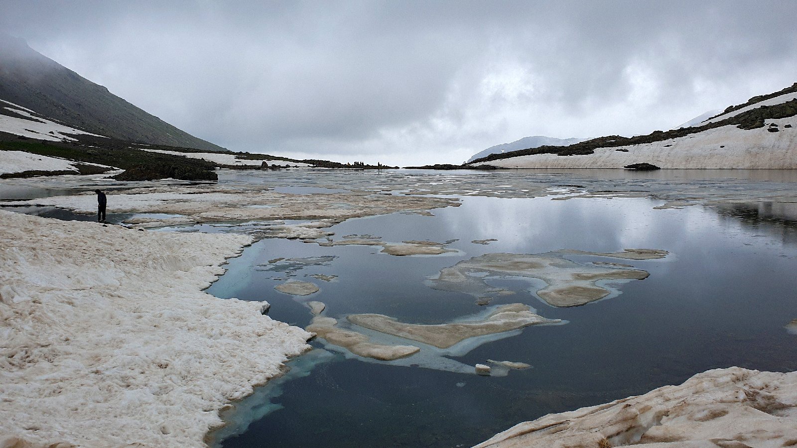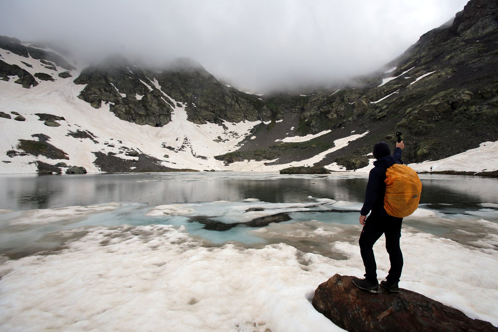 Bu noktada dolu yağışına yakalanan sporcular buzla kaplı gölde yağışa aldırmadan fotoğraf çektikten ve tulum dinledikten sonra bu kez yağmur yağışı altında 2 bin 720 metre rakımdaki Büyük göle ulaştı.