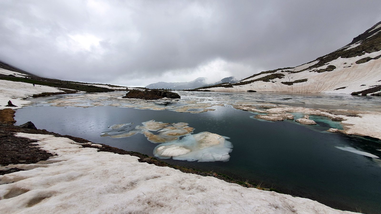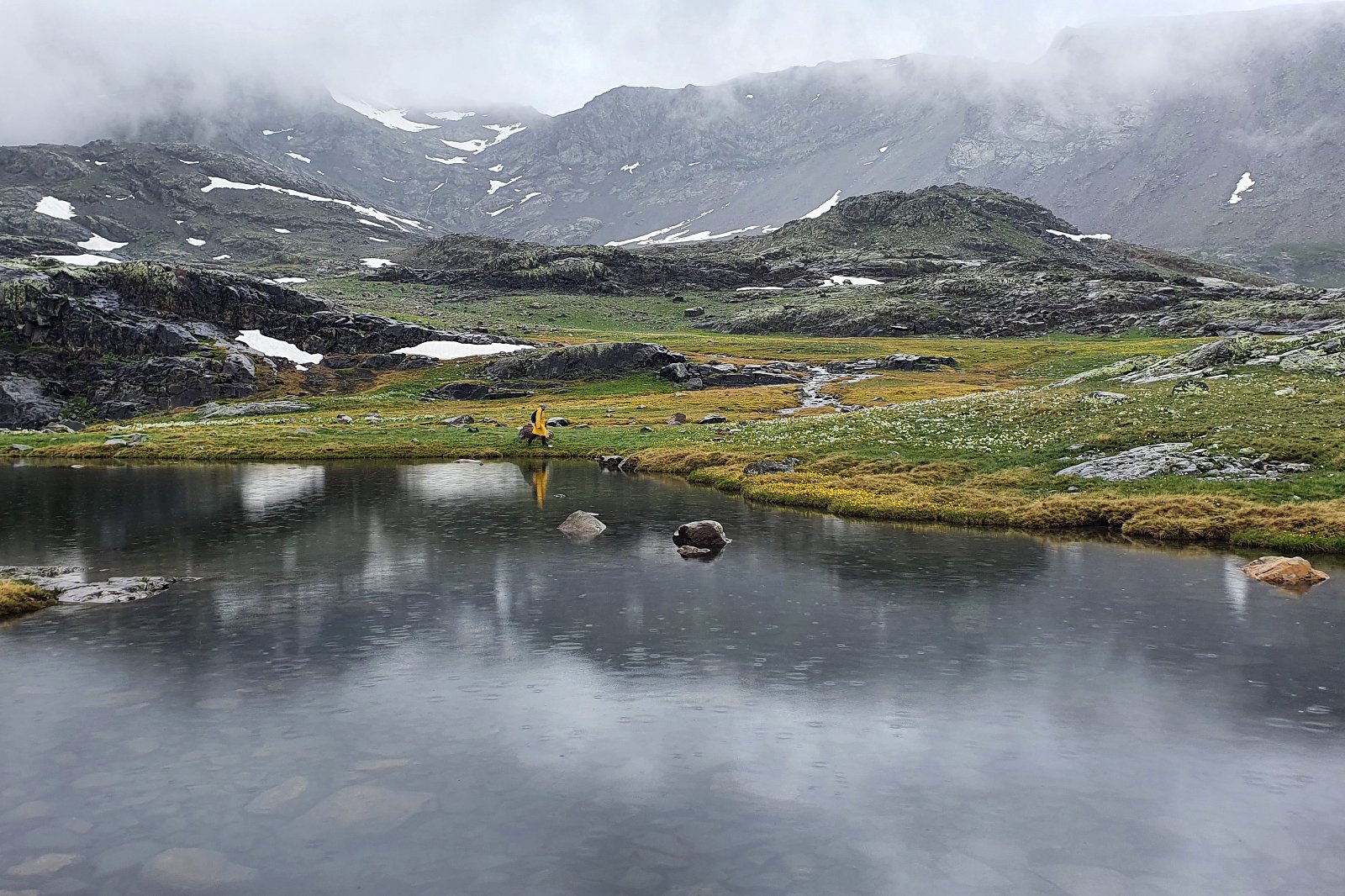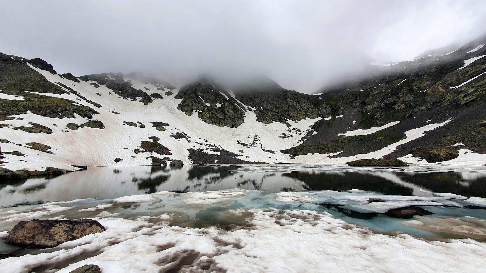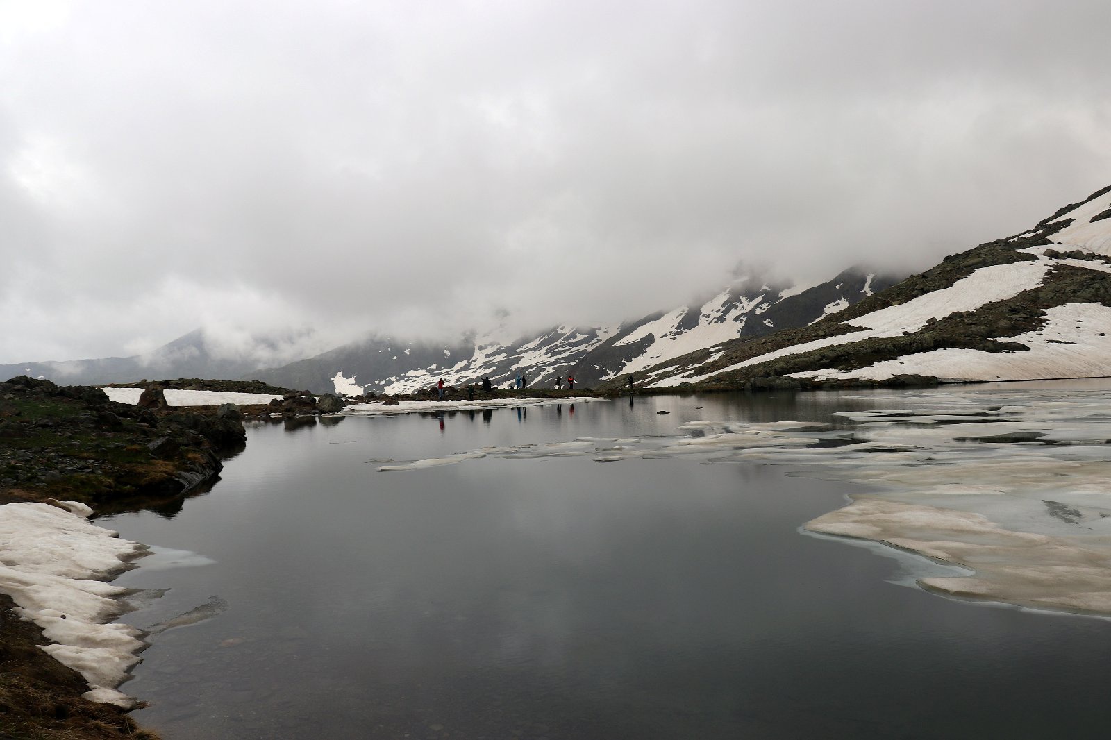Bu noktada dolu yağışına yakalanan sporcular buzla kaplı gölde yağışa aldırmadan fotoğraf çektikten ve tulum dinledikten sonra bu kez yağmur yağışı altında 2 bin 720 metre rakımdaki Büyük göle ulaştı.