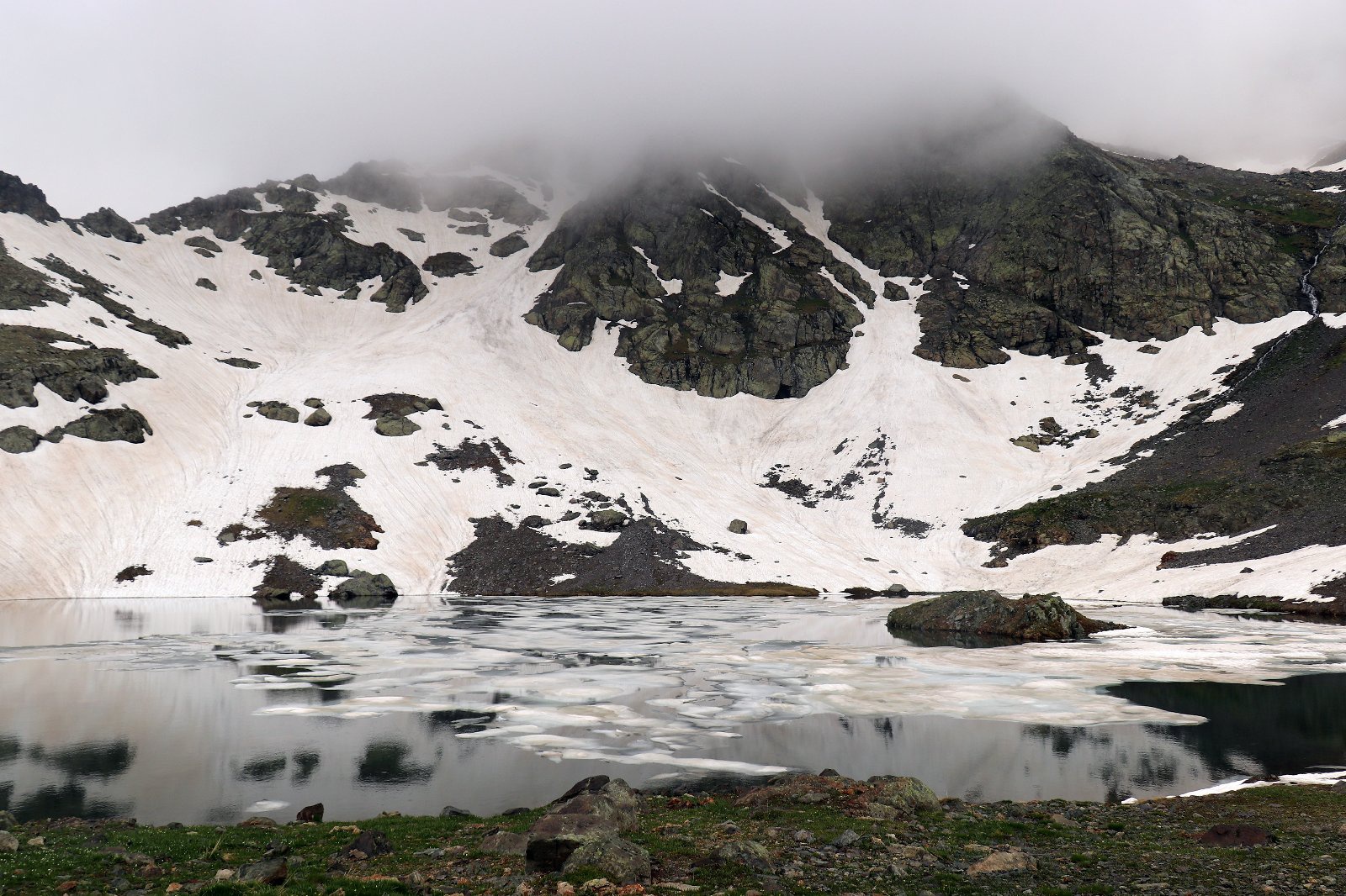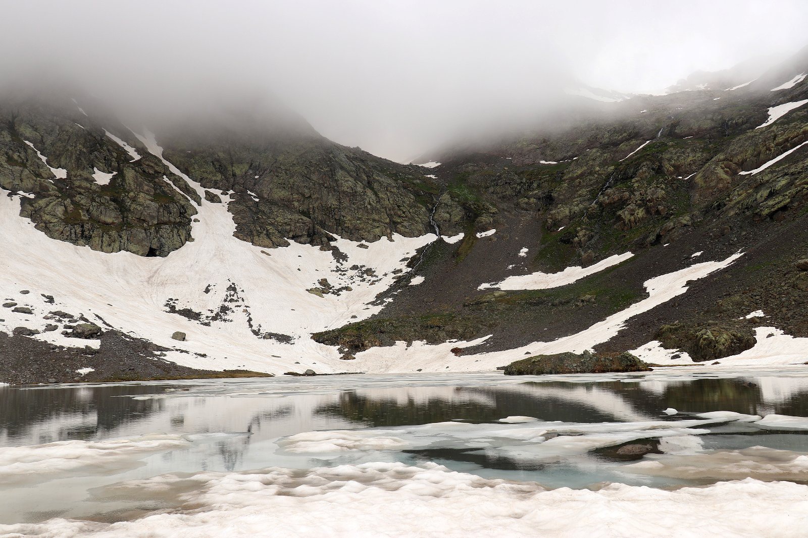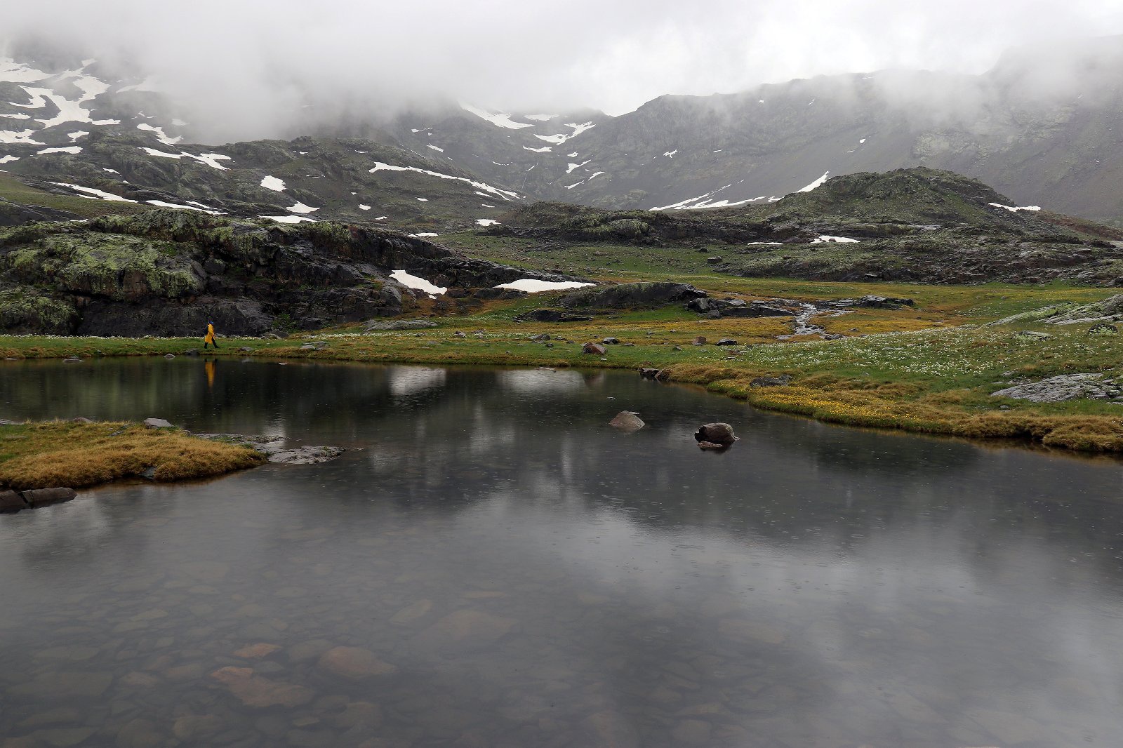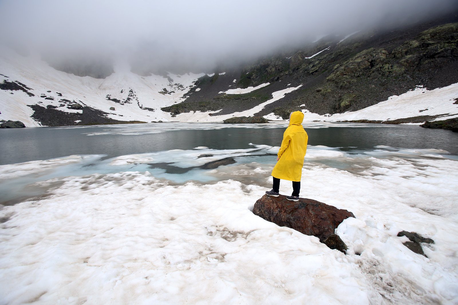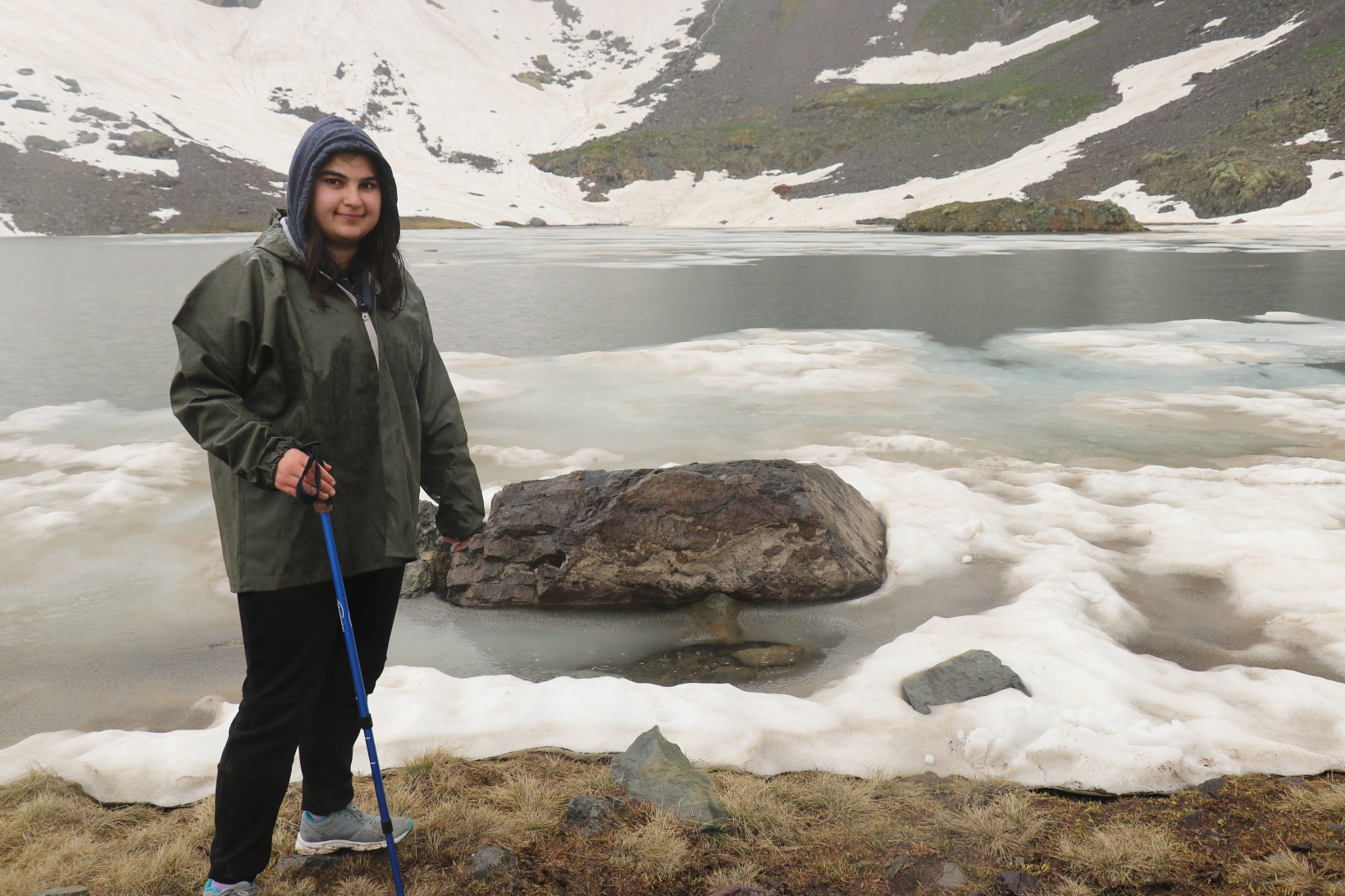 Bu noktada dolu yağışına yakalanan sporcular buzla kaplı gölde yağışa aldırmadan fotoğraf çektikten ve tulum dinledikten sonra bu kez yağmur yağışı altında 2 bin 720 metre rakımdaki Büyük göle ulaştı.