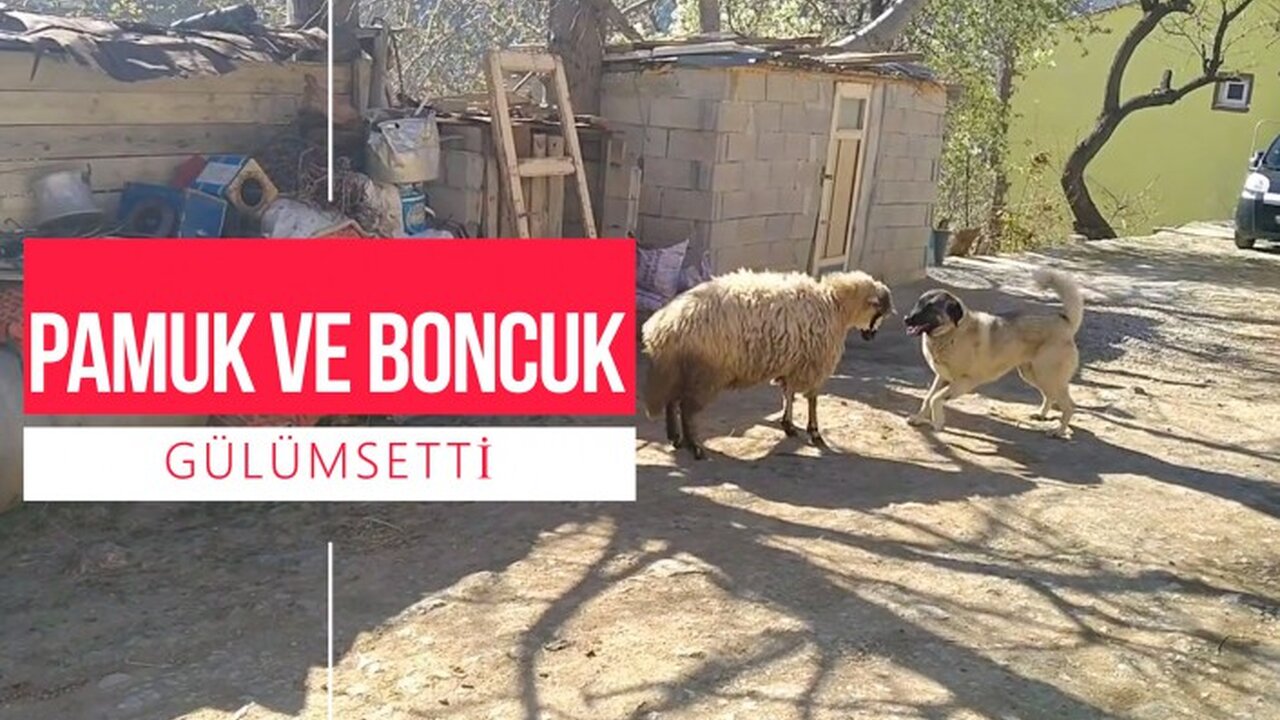 Gümüşhane’de yaşayan Adil Bilgin’in ‘Pamuk’ isimli koyunu ve ‘Boncuk’ isimli köpeğinin kıyasıya mücadeleye sahne olan oyunları izleyenleri gülümsetti.