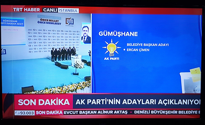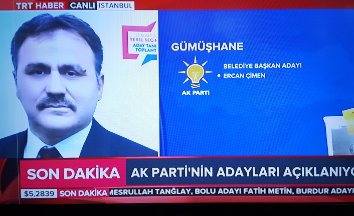 İstanbul Haliç Kongre Merkezinde çok sayıda ilin Belediye Başkanı adayının açıklandığı törende Cumhurbaşkanı Recep Tayyip Erdoğan, Başkan Çimen’i partisinin Gümüşhane adayı ¬olarak anons etti. Cumhurbaşkanı Erdoğan daha sonra Milletvekilleri Hacı Osman Akgül, Cihan Pektaş, AK Parti İl Başkanı Av. Celalettin Köse, Kadın Kolları İl Başkanı Münire Şeyhoğlu ve Gençlik Kolları İl Başkanı Emrah Elmahti ile sahnede hatıra fotoğrafı çektirdi.