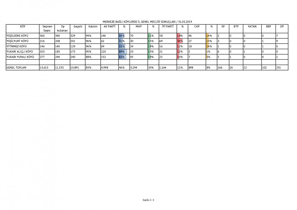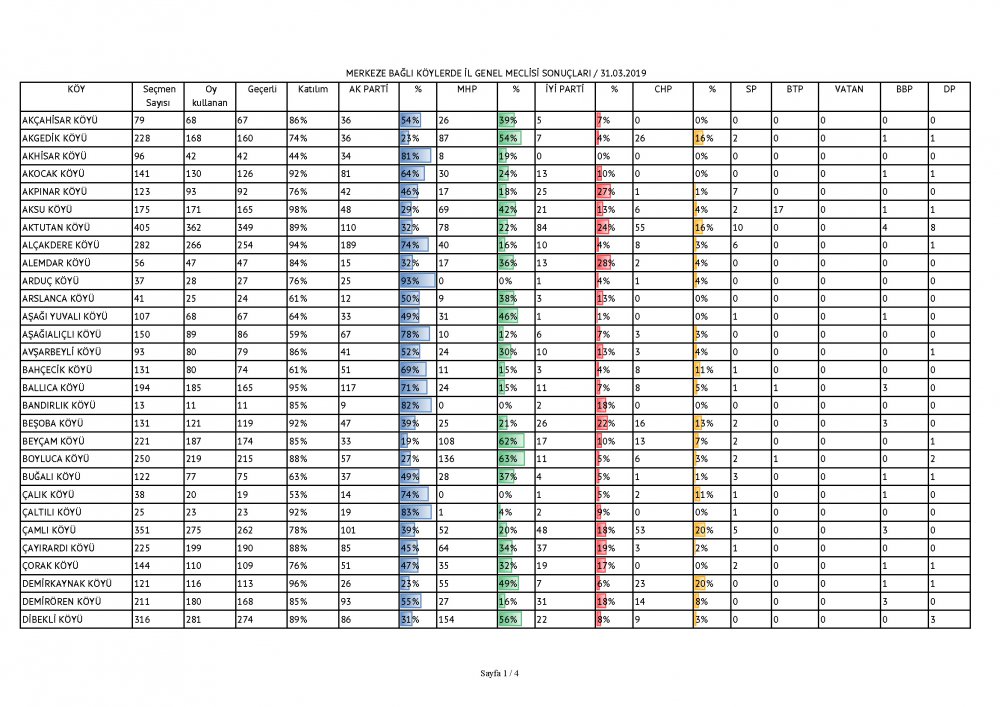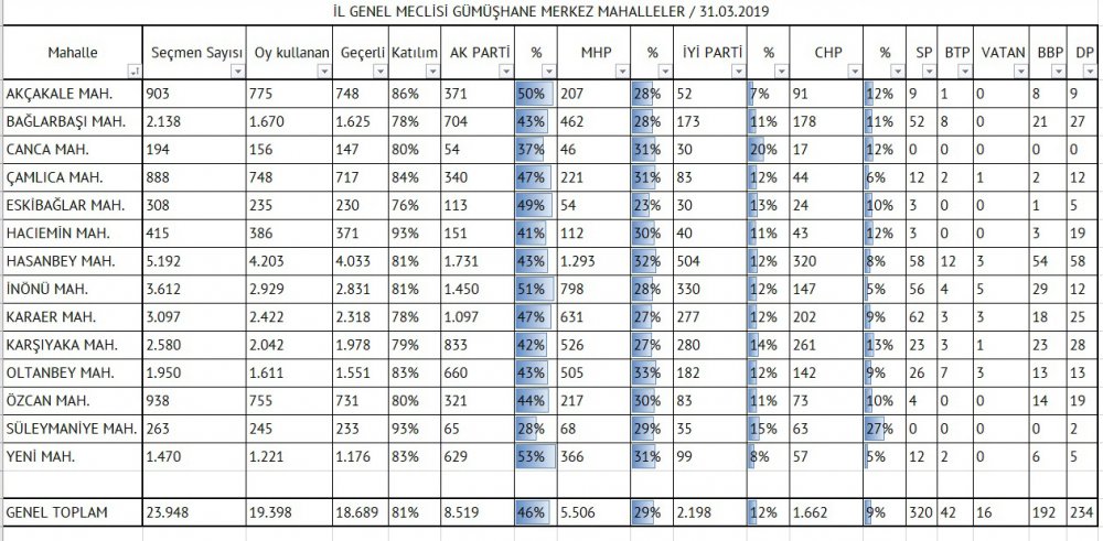 Gümüşhane'nin merkeze bağlı 92 köyünde ve il merkezindeki 14 mahallenin 31 Mart tarihinde yapılan Mahalli İdareler Genel Seçimlerinde İl Genel Meclisi üyeliği için hangi köyün hangi partiye oy verdiği belli oldu.