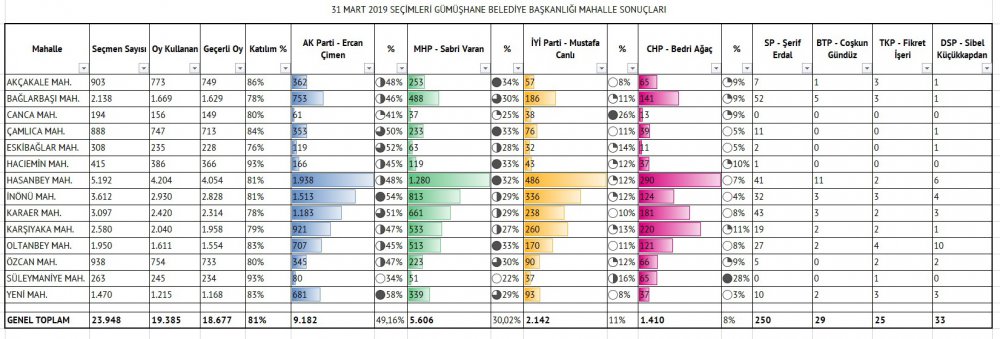 Gümüşhane kent merkezinde 31 Mart pazar günü yapılan mahalli idareler genel seçimlerinde mahallelerde verilen oylar belli oldu.